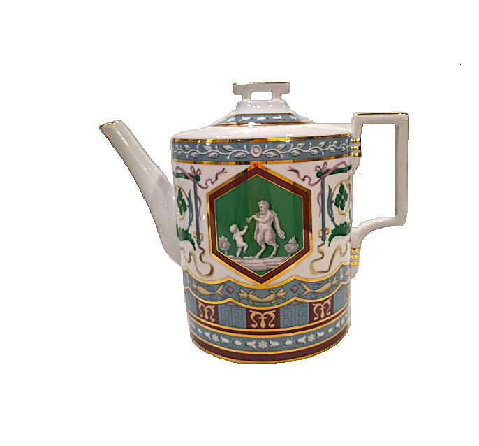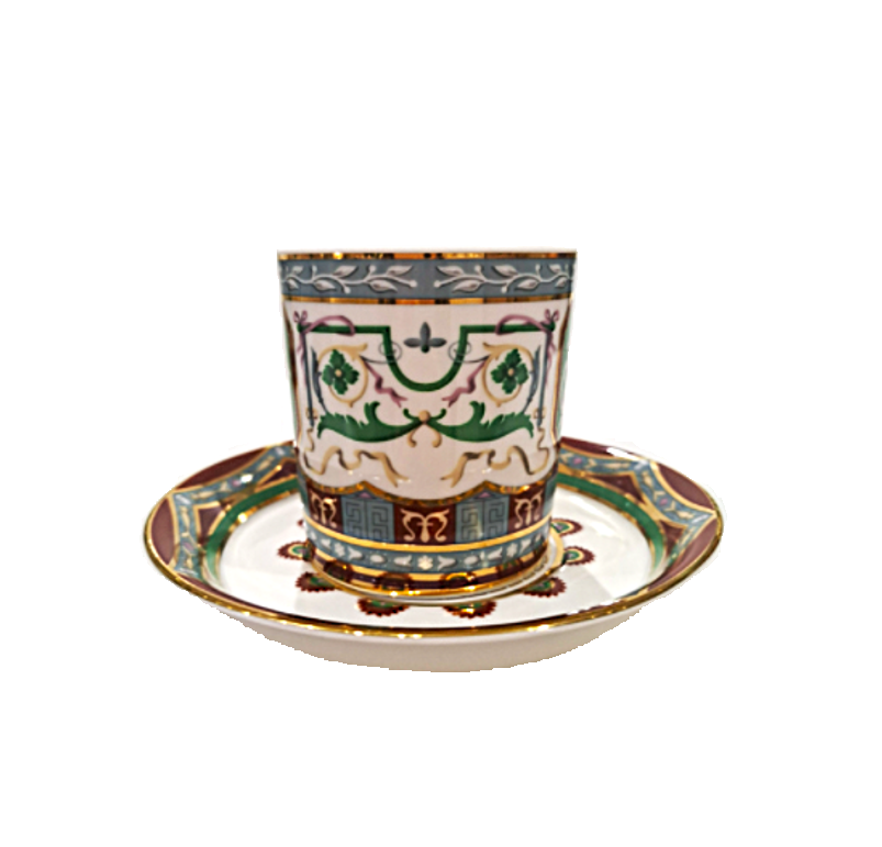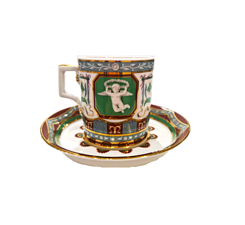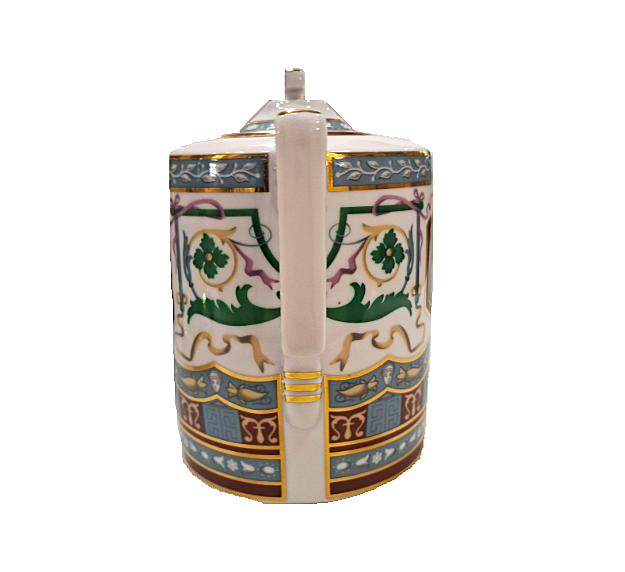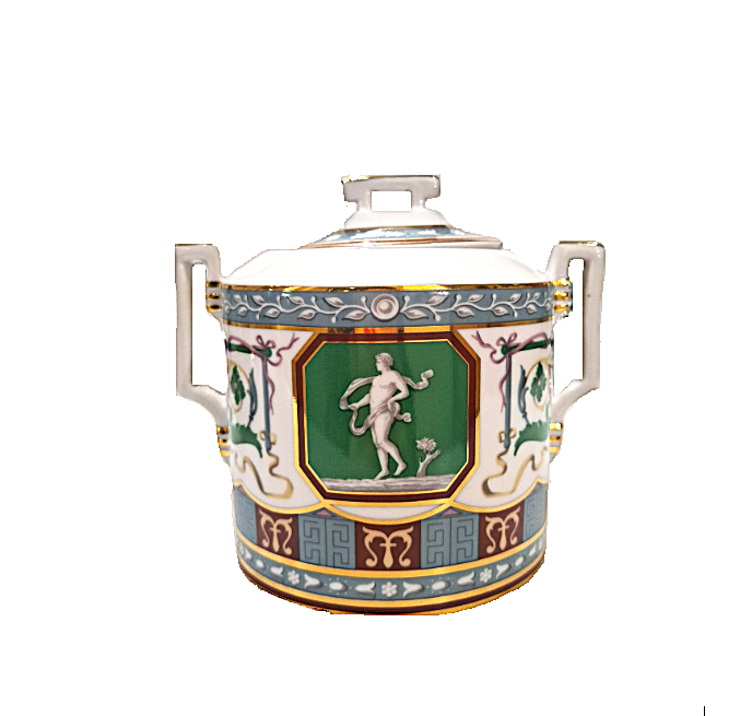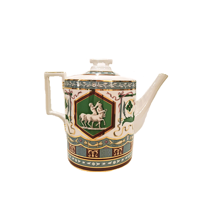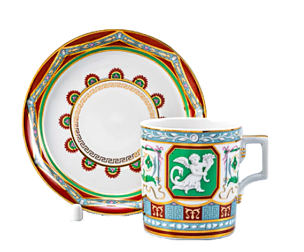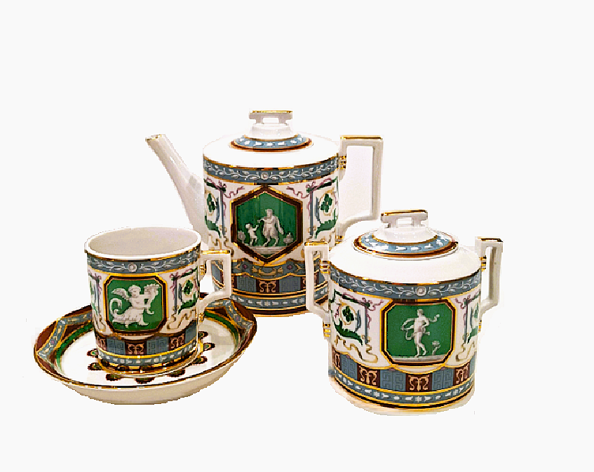 Императорском Фарфоровом Заводе из классического твердого фарфора. Форма отливается вручную. Для декорирования используется надглазурная деколь. Форма "Гербовая" восстановлена по музейному образцу. Рисунок "Античный" выполнен по мотивам музейного образца знаменитого "Рафаэлевского" столового ансамбля, который был заказан на ИФЗ в 1883 году Александром III, и назван так по орнаменту, скопированному с рисуноков знаменитой галереи, сооруженной в началне XVI в Ватикане во дворце Папы Римского, по проекту архитектора Д.Браманте. Выпуск изделия начался в 2017 году.