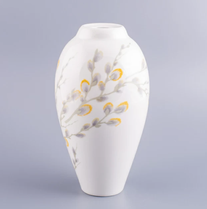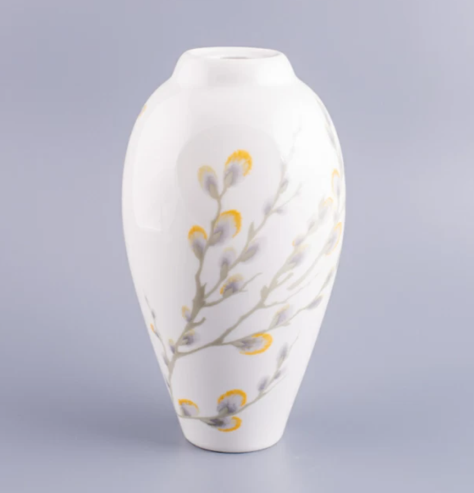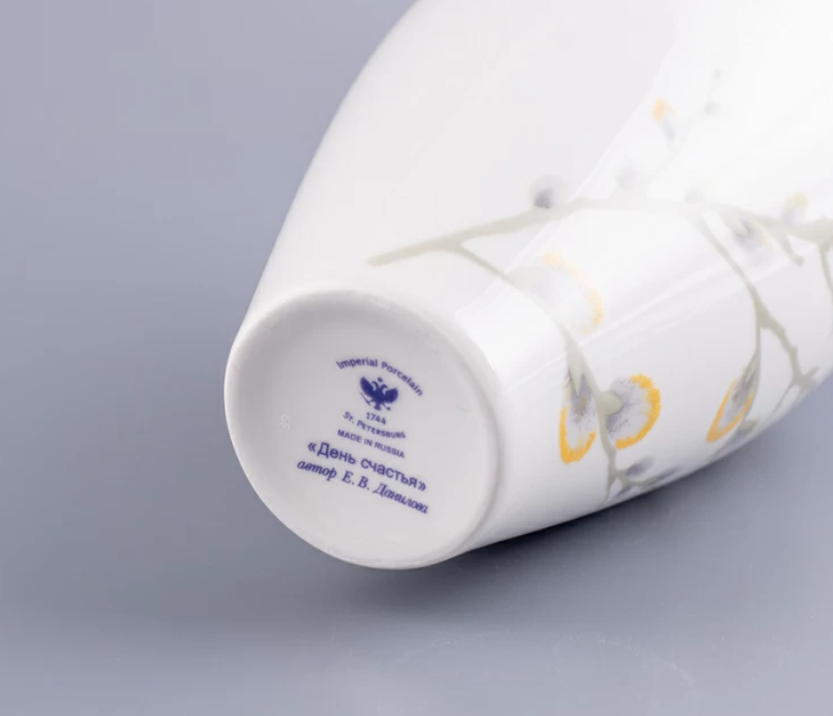 Плавно изогнутые ветви вербы стали центральным мотивом в декоре вазы «День счастья». Приглушенные «акварельные» тона росписи, мягкие цветовые переходы, сложная нюансировка одного цвета в сочетании с белой поверхностью фарфора создают впечатляющий эффект мастерски исполненного произведения для украшения самого изысканного интерьера.